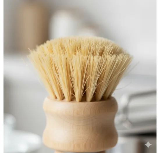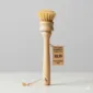 Een afwasborstel met een handvat van beukenhout en borstels van sisal, volledig plasticvrij en biologisch afbreekbaar.