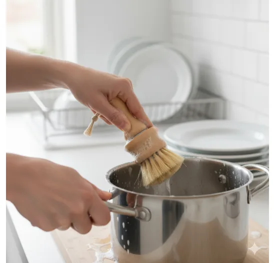 Deze borstel is perfect voor het schoonmaken van potten en pannen. De vervangbare kop maakt hem extra duurzaam. Een must-have voor een plasticvrije keuken.